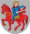 Hopeakentässä punaisella hevosella ratsastava Pyhä Martti leikkaamassa miekallaan kappaletta viitastaan. Pyhimyksen kasvot ja kädet luonnonväriä, puku sininen, viitta ja saappaat punaiset, miekka hopeaa sekä sädekehä ja tukka kultaa. Hevosen varustus ja v